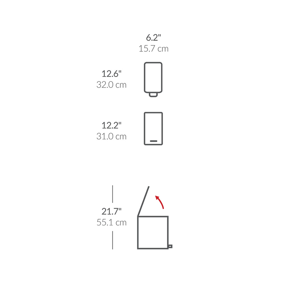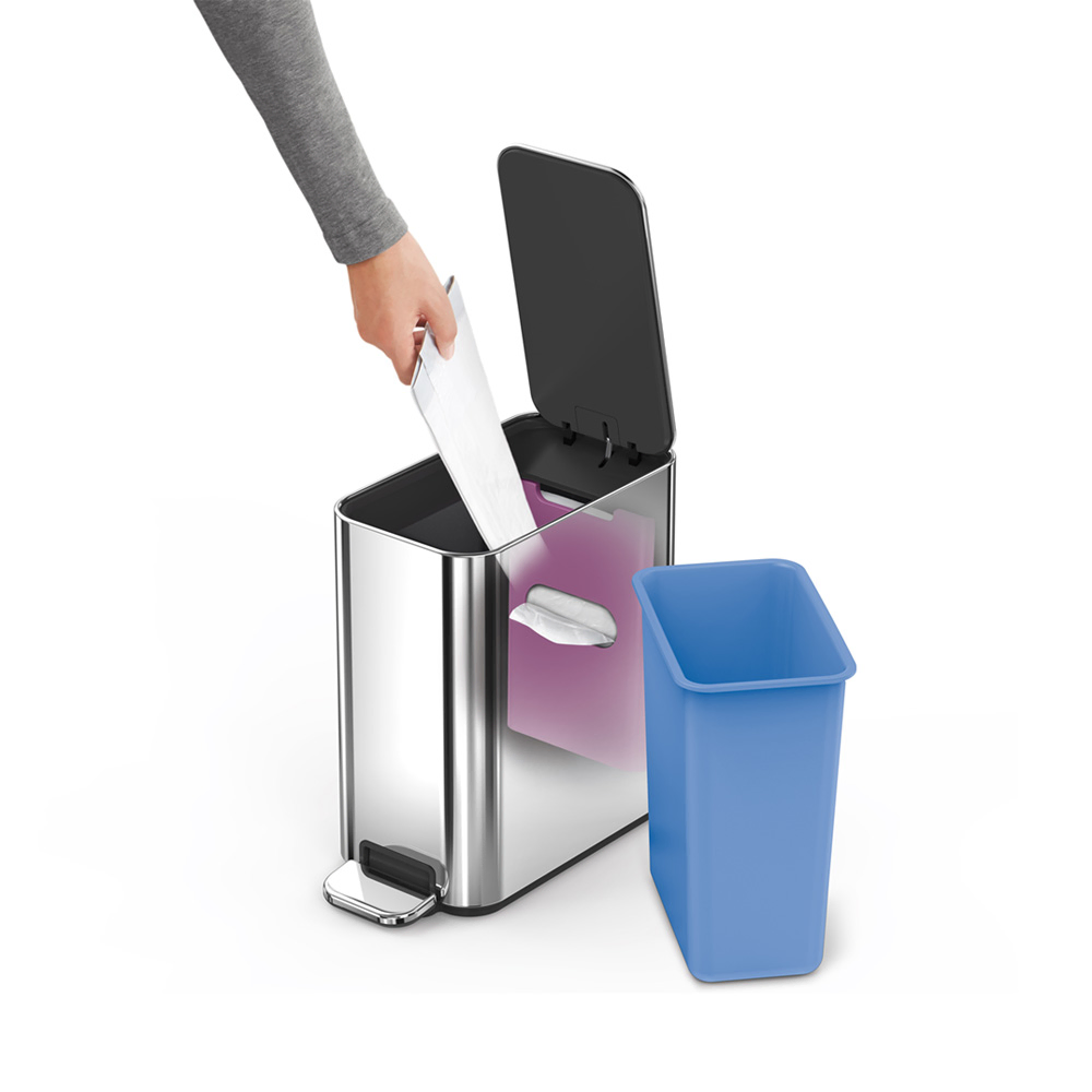 پدال فولادی بادوام برای دوام طراحی شده است و فناوری ثبت اختراع شده‌ی شوک درب، بسته شدن روان و بی‌صدای درب را در هر بار استفاده تضمین می‌کند.سطح استیل ضد زنگ توسط یک پوشش نامرئی یون نقره محافظت می‌شود که در برابر اثر انگشت و میکروب مقاوم است.سطل داخلی که از ۱۰۰٪ پلاستیک بازیافتی پس از مصرف ساخته شده است، برای تعویض سریع آستر و تمیز کردن آسان، به بیرون کشیده می‌شود.لولا داخلی شیک به درب اجازه می‌دهد تا به راحتی باز شود، حتی زمانی که سطل زباله به صورت تراز با دیوار قرار گرفته باشد.درپوش‌های سفارشی کد B با ضخامت بسیار زیاد و درز دوبل، کاملاً در این سطل زباله جای می‌گیرند و بسته‌های پر کردن مجدد آستر را می‌توان به راحتی در جیب آستر نگهداری کرد.